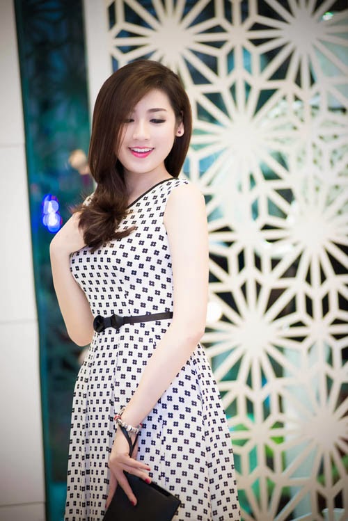 Thiết kế kín đáo, phù hợp với vóc dáng nữ tính của người đẹp .Tú Anh với chiếc váy có họa tiết chấm bi cổ điển.Mẫu váy phù hợp với hình ảnh nữ tính và duyên dáng của Tú Anh.Lợi thế làn da trắng hồng giúp Á hậu dễ dàng phù hợp với nhiều mẫu trang phục.Tú Anh khoe da trắng, dáng chuẩn với mẫu trang phục có tông màu nổi